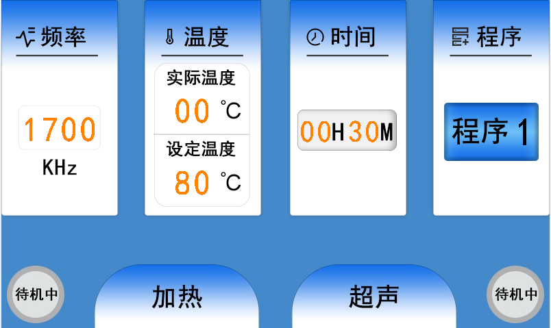 顯示屏顯示工作頻率、工作程序、超聲時(shí)間、實(shí)際溫度和設(shè)定溫度和工作狀態(tài)等信息,其中工作程序、時(shí)間、設(shè)定溫度等可以點(diǎn)擊相應(yīng)位置進(jìn)行設(shè)置。